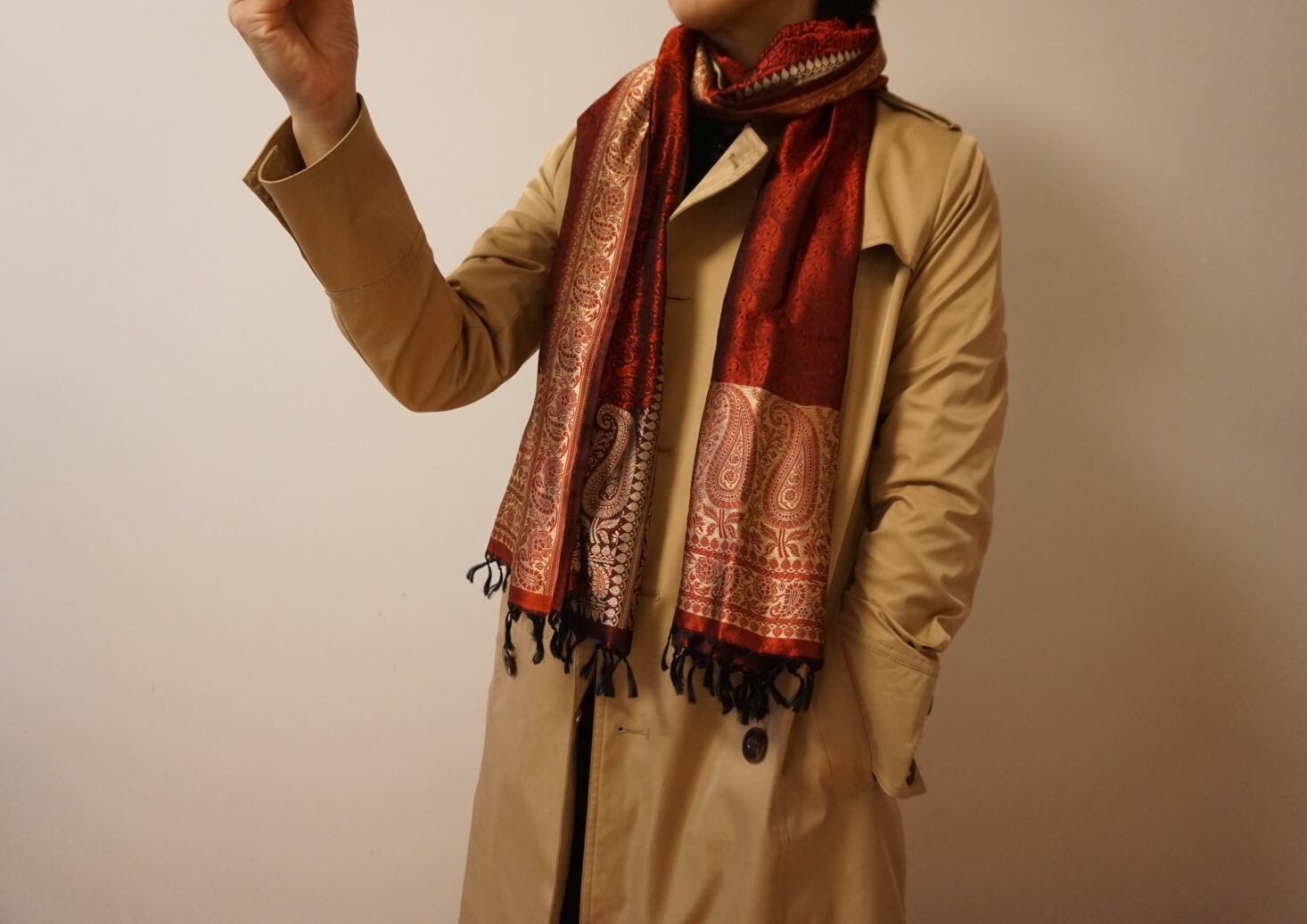 裏側はレッドからゴールドに変化しますが、派手にはならずにむしろ表よりも落ち着いた輝きをもたらしてくれます。シックで落ち着いた大人のレッド×ブラック、首元にプラスするだけでガラリと雰囲気を変えてくれます。