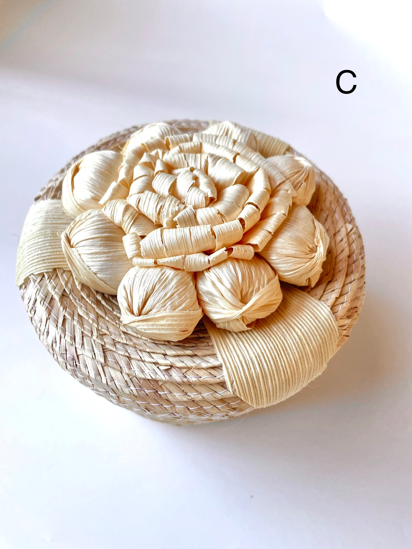 *蓋の花飾り部分はパリパリしており、小さく剥がれている部分があります。出荷前に浮いてる部分は処理していますが、自然素材の特性でございます。ご了承くださいませ。