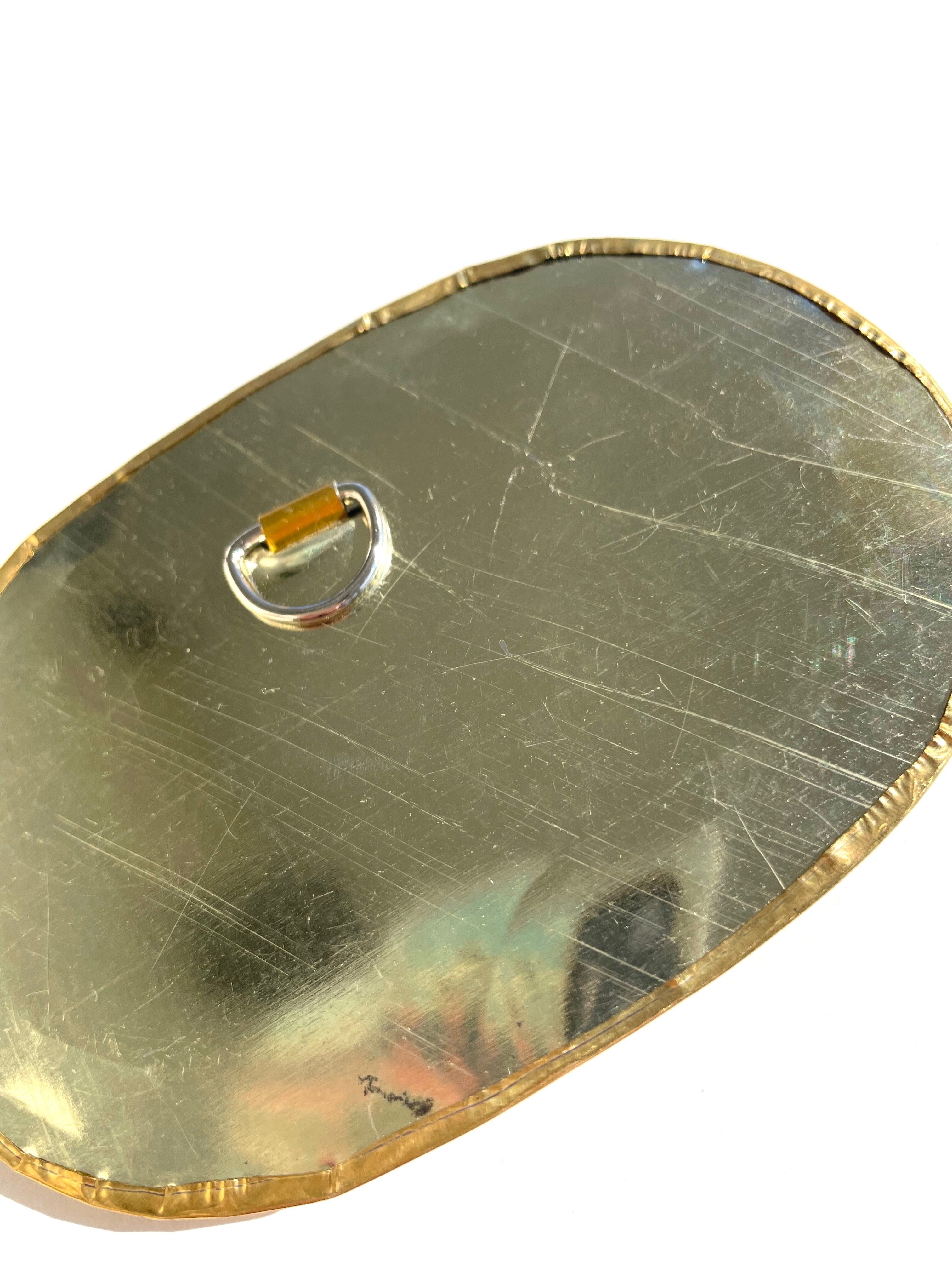 モロッコ、マラケシュより、真鍮で装飾されたミニミラーです。壁掛け部品が付いていますが、ポーチに入れて携帯もできるサイズになります。