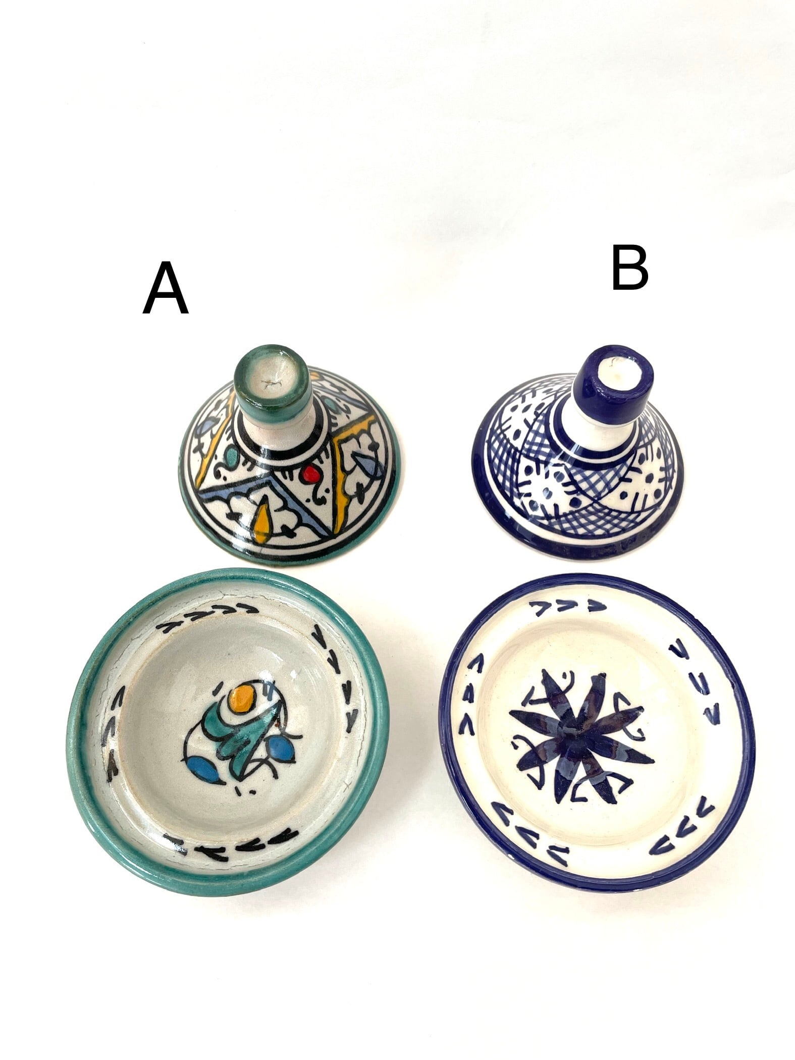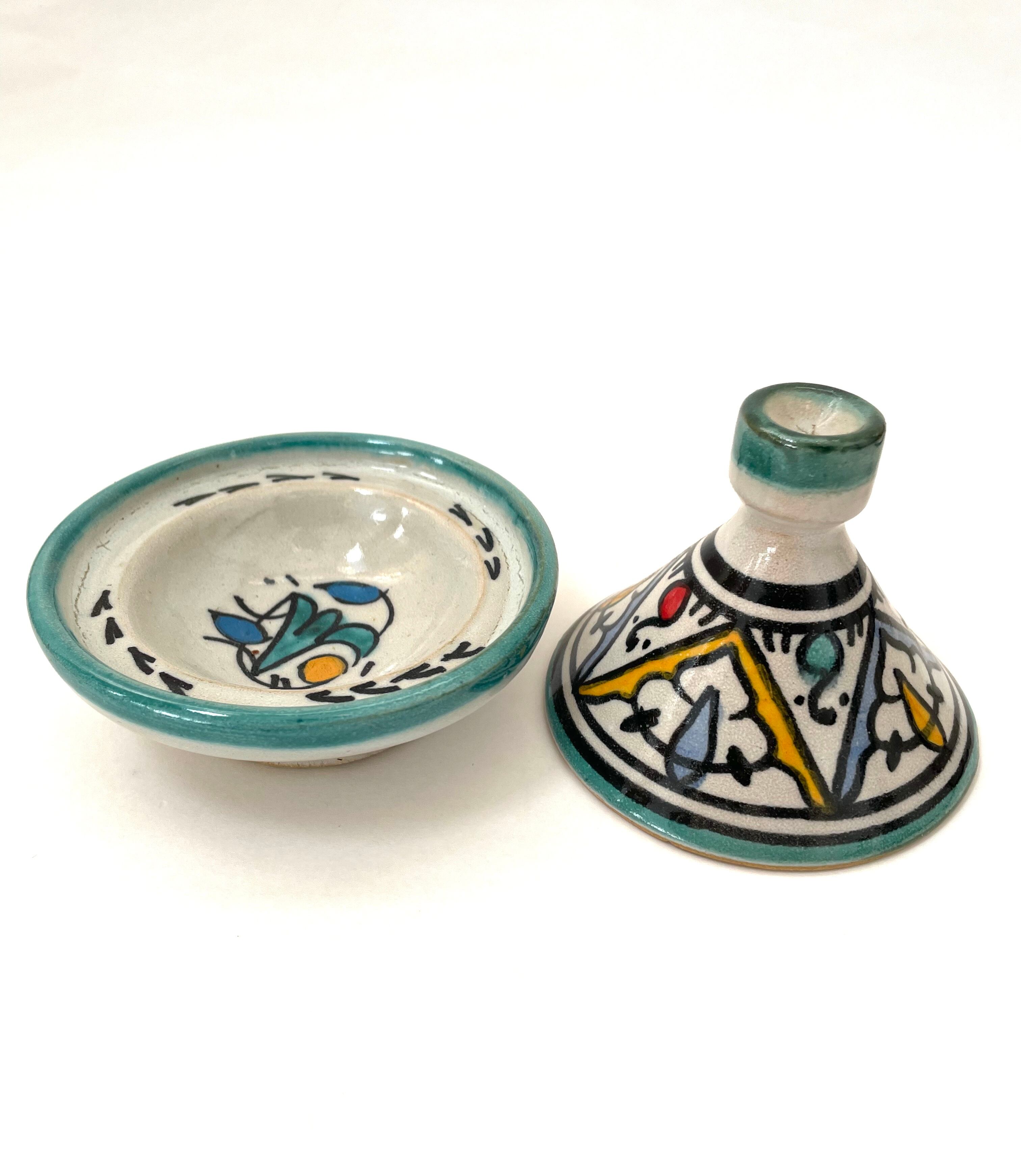 小物入れです。現地ではスパイスや、バター、ジャムを入れてテーブルに出したりと、調味料入れとして使用されています。模様は現地の職人がフリーハンドで描いており、温かみがあります。
