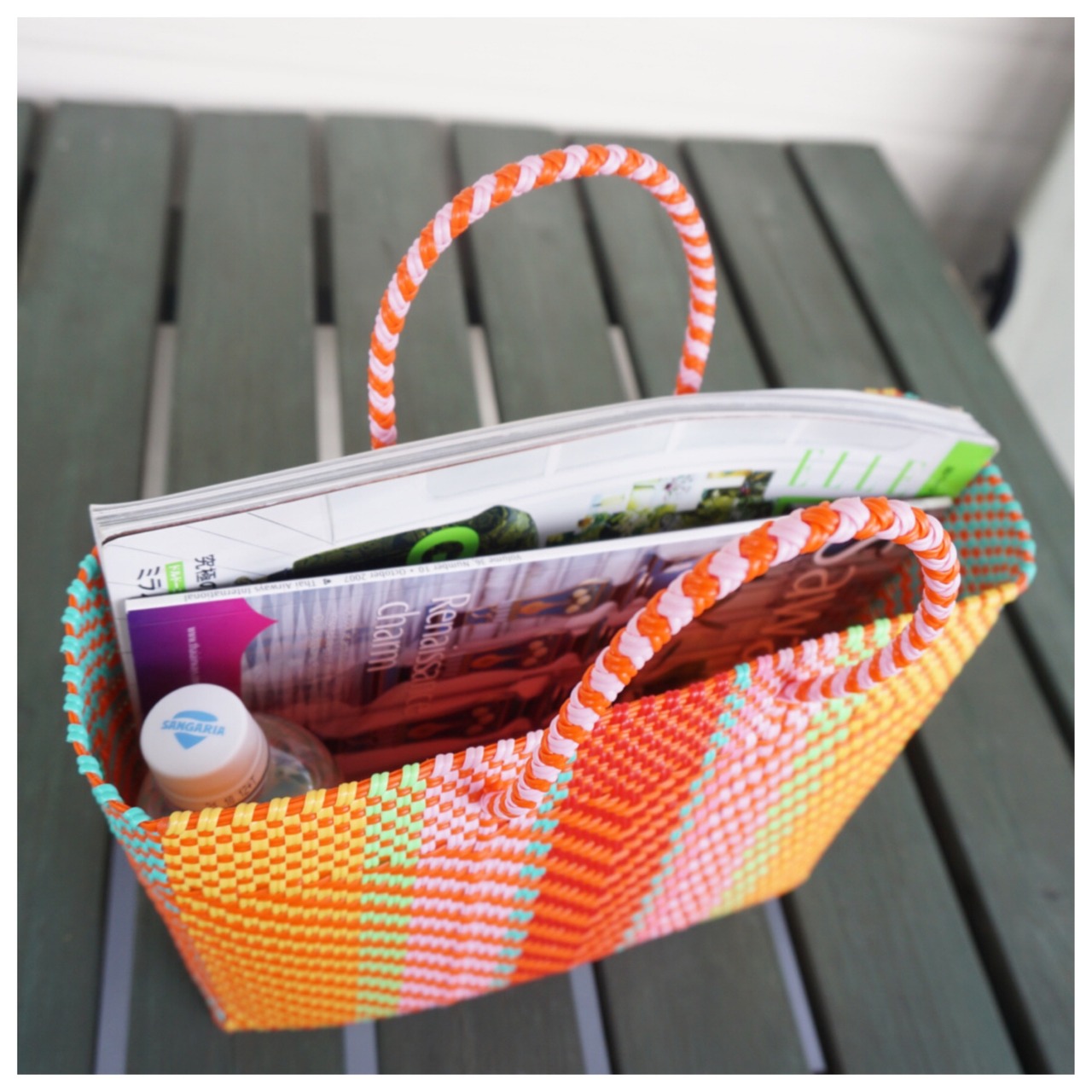 メキシコ、オアハカにて職人さんが一つ一つ丁寧に手作りしたメルカド(市場)バックです。リサイクルプラスチックを使用したサスティナブルなカゴバック、水洗いもできとても丈夫に作られています。