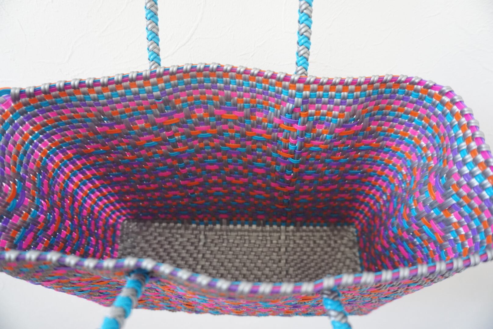 メキシコ、オアハカにて職人さんが一つ一つ丁寧に手作りしたメルカド(市場)バックです。リサイクルプラスチックを使用したサスティナブルなカゴバック、水洗いもできとても丈夫に作られています。