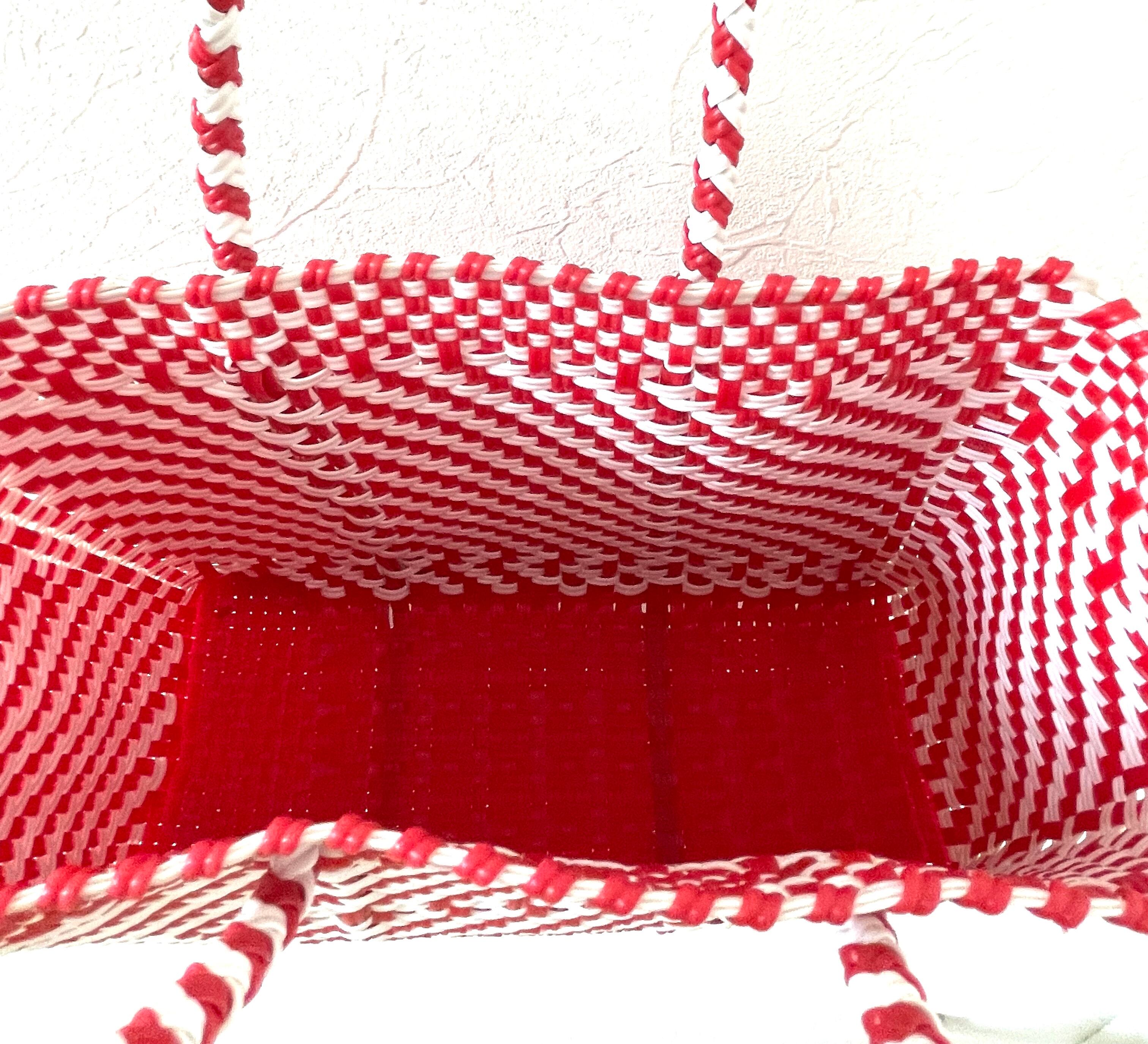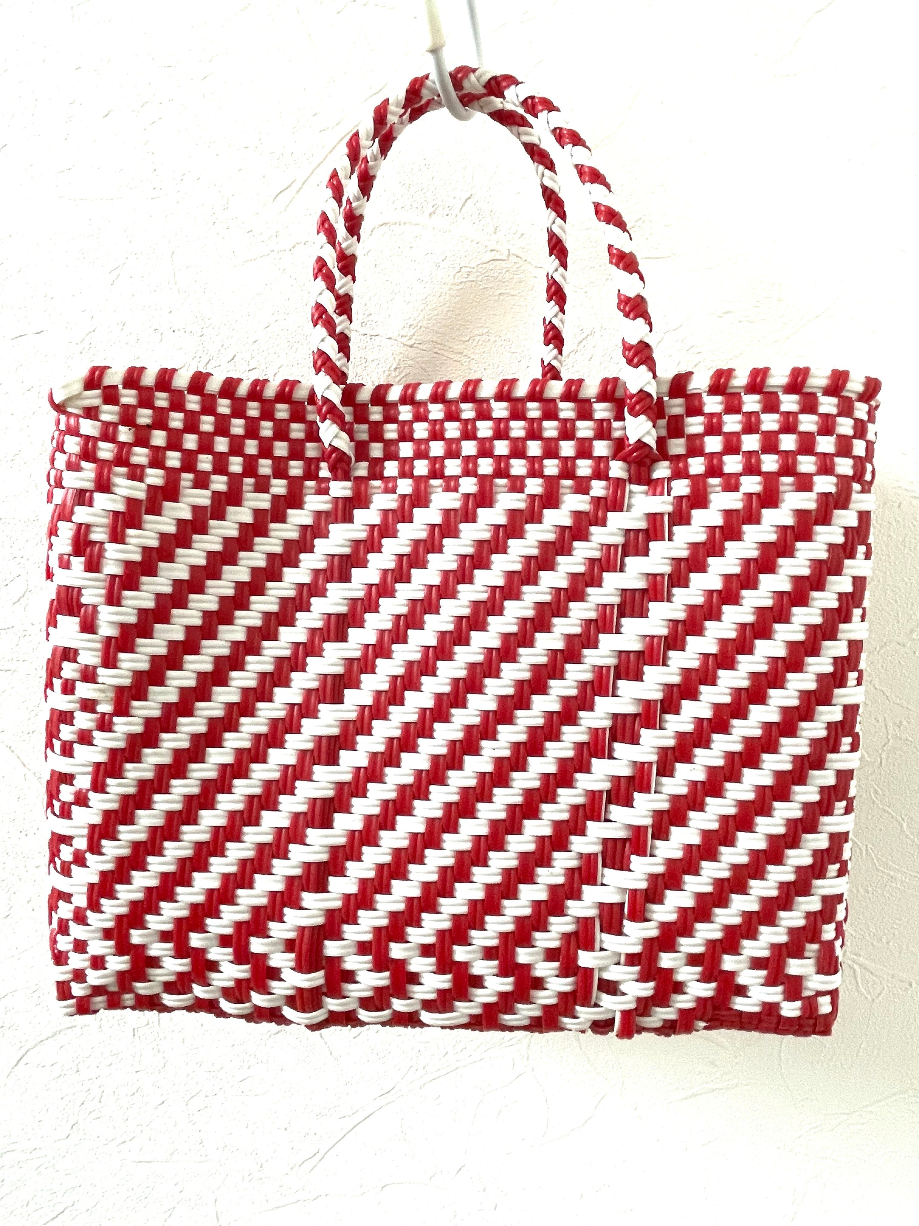 メキシコ、オアハカにて職人さんが一つ一つ丁寧に手作りしたメルカド(市場)バックです。リサイクルプラスチックを使用したサスティナブルなカゴバック、水洗いもできとても丈夫に作られています。
