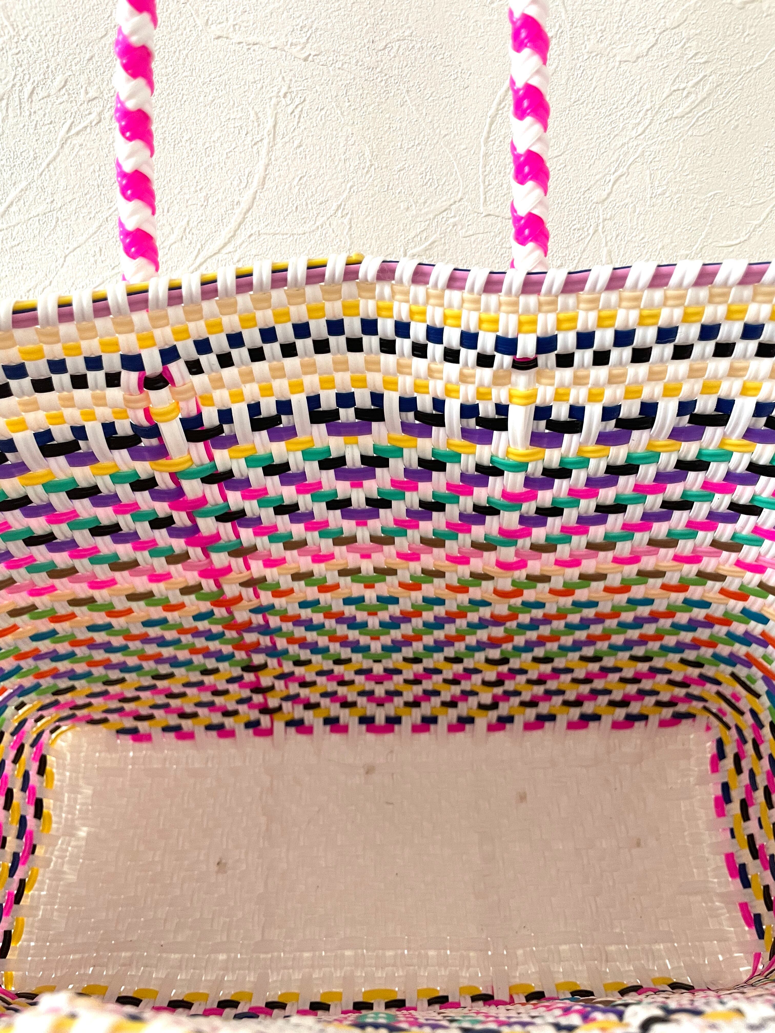 メキシコ、オアハカにて職人さんが一つ一つ丁寧に手作りしたメルカド(市場)バックです。リサイクルプラスチックを使用したサスティナブルなカゴバック、水洗いもできとても丈夫に作られています。